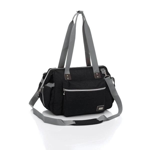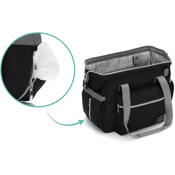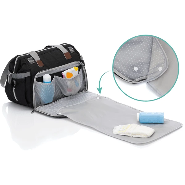 La borsa può essere usata a tracolla oppure portata a mano. Se vi piace la comodità, potete appendere la borsa alla carrozzina o al passeggino. Lo spazioso scomparto interno permette lo stivaggio di tutto il necessario per il cambio.