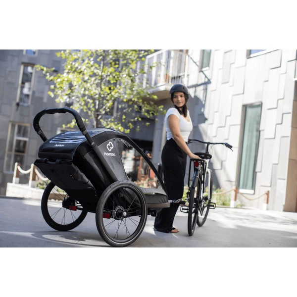 rimorchio dietro una bicicletta. In modalità passeggino, il rimorchio può