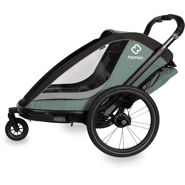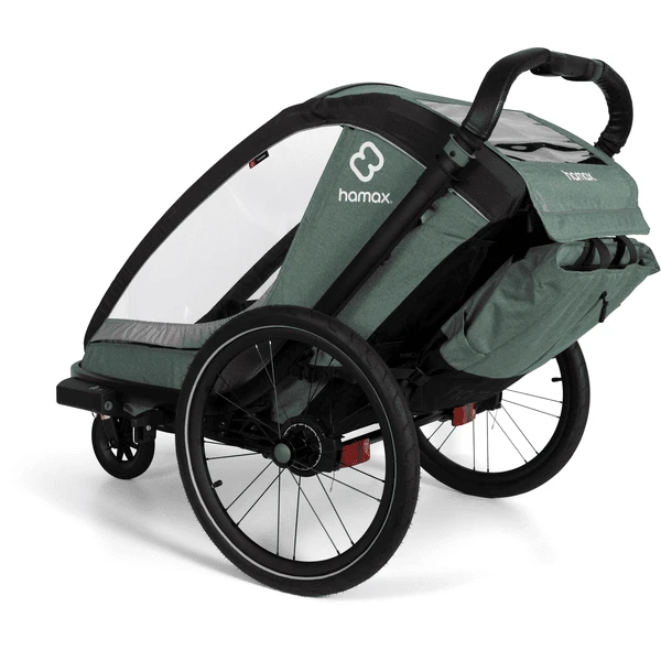 rimorchio dietro una bicicletta. In modalità passeggino, il rimorchio può